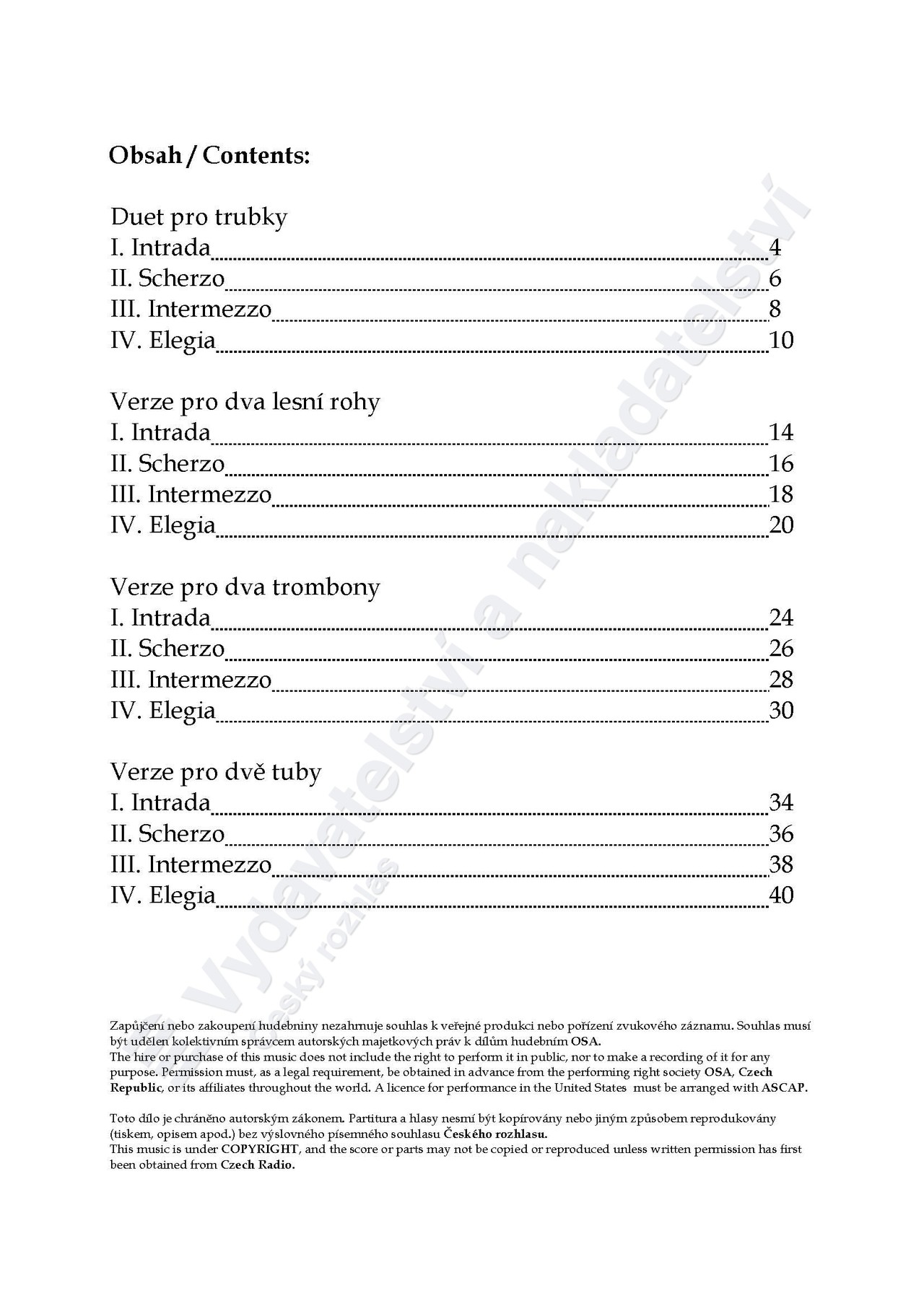 Čtyřvětý cyklus uvádí dílo krátkou Intradou v h-moll, ve které se rozehrávání obou trubek rychle přemění do závažné atmosféry dalších vět. Následující Scherzo v d-moll je spíše úšklebkem než vtipem. Přináší kontrastní plochy půltónů a širokých intervalů na pozadí dramatických harmonických jevů a dílo se stává temnějším. Třetí věta, Intermezzo v B-dur, jehož dynamický rozsah se pohybuje mezi ppp a pp, nahlédne do světa naprostého klidu, kde jediným pohybem jsou vzpomínky přicházející v různých harmonických odstínech, oproštěné od usilování.