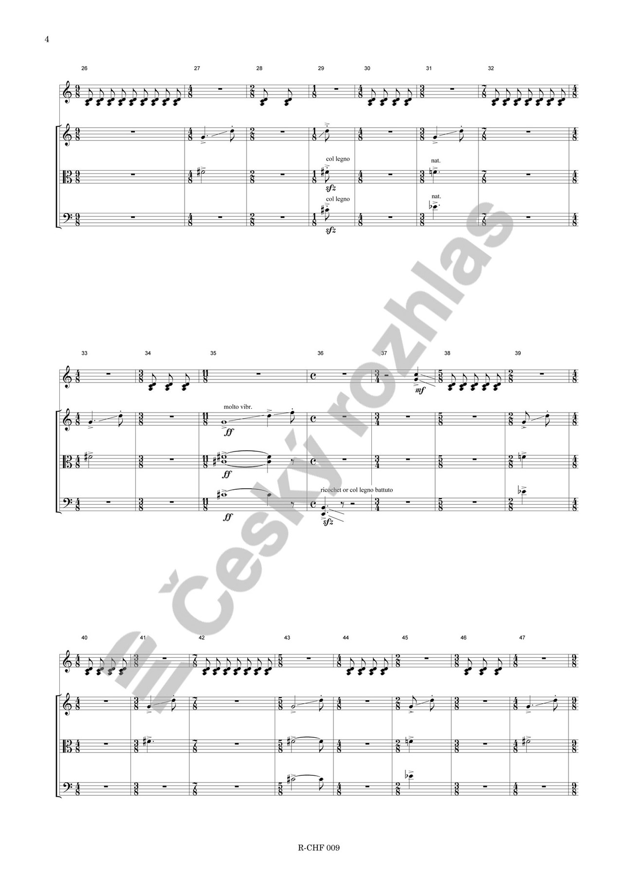 To jediné, co nakonec z Hendrixe ve skladbě zůstalo, jsou dva akordy (cis moll 7, h moll 7), které mi posloužily jako materiálový základ. Základní myšlenkou, sjednocující pětidílnou formu složenou z vnitřně kontrastující hudby, se stalo používání určitých loci communes, hudebních momentů společných více částem skladby. V každé části pak byly tyto momenty použity ve zcela odlišném kontextu – tu jako spojovací článek formy, tu jako ostinato atd. V partituře je předepsáno použití kytarových efektů (flanger a wah-wah pedál), to nicméně není nezbytné. Smyčce nejsou amplifikovány.“