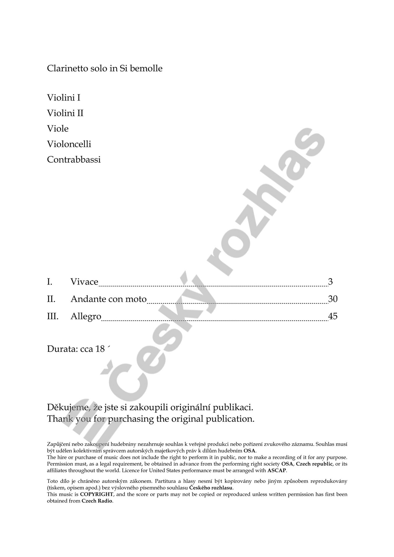 Klarinetový koncert D dur má tři části: 1. Vivace, 2. Andante con moto, 3. Allegro. Snažil jsem se využít barevných a dynamických možností klarinetu.