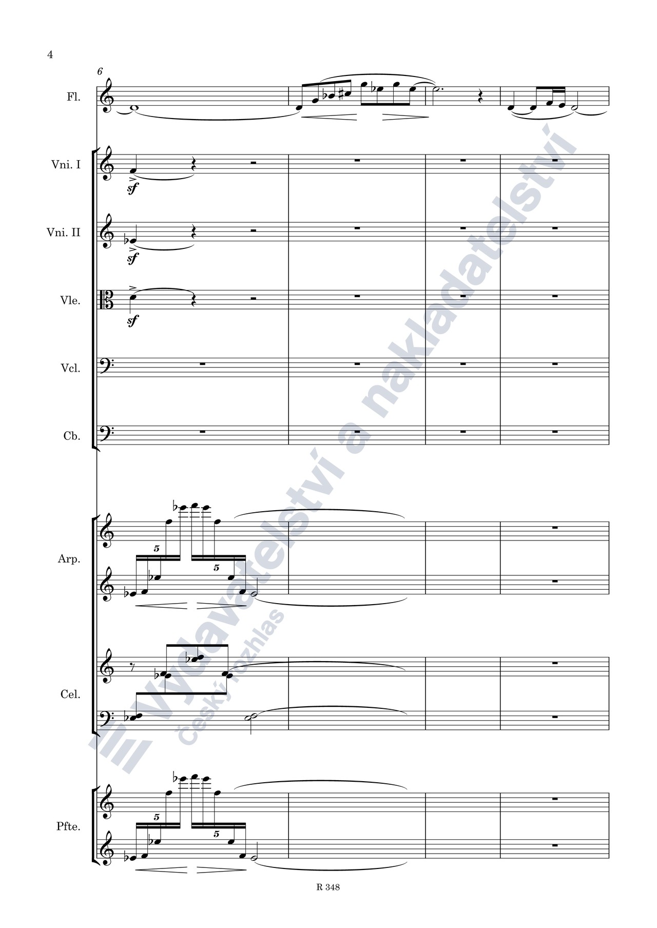 obsazení: fl solo, arp, cel (pfte), vni I, II, vle, vlc, cb