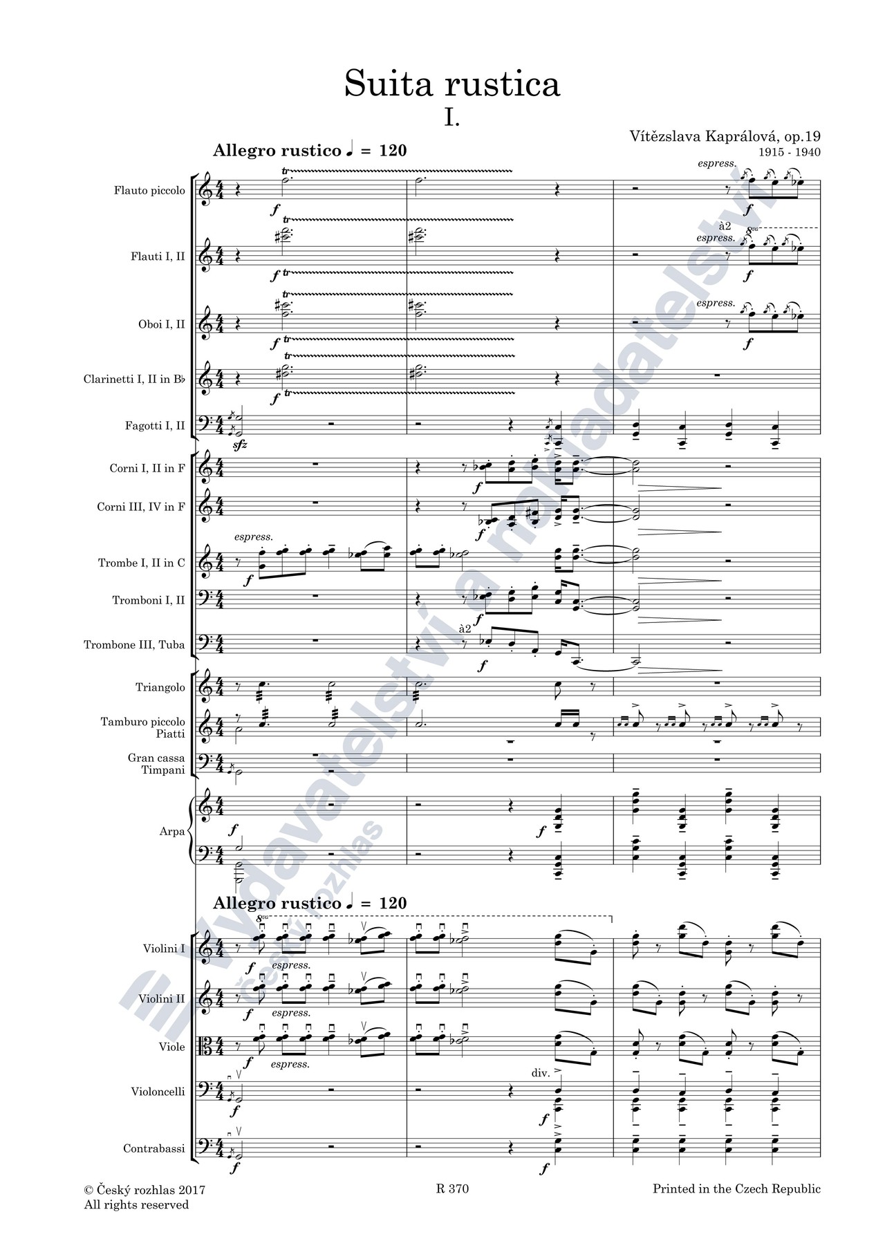 Když asi v polovině října Kaprálová obdržela od vydavatelství písemný dotaz, zda tedy mohou se suitou počítat, ihned přerušila práci na dalších projektech, aby dodržela termín dodání objednané skladby do 15. listopadu. Postupovala obdivuhodným tempem: skicu suity, kterou nazvala Suita rustica (s podtitulem Suita z českých lidových písní a tanců), měla hotovu již 2. listopadu a orchestraci dokončila 10. listopadu.