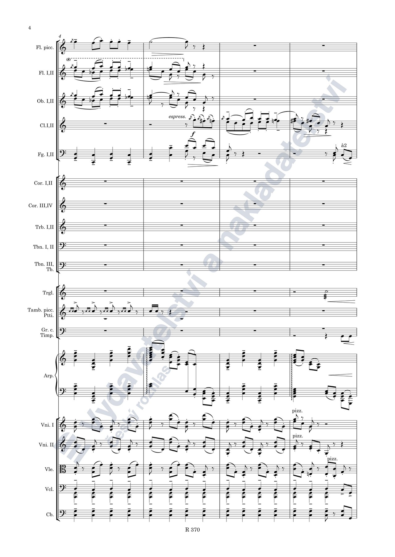obsazení: fl picc, fl I, II, ob I, II, cl I, II, fg I, II, cor I, II, III, IV, trb I, II, tbn I, II, III, tb, trgl, tamb picc, ptti, gr c, timp, arp, vni I, II, vle, vlc, cb