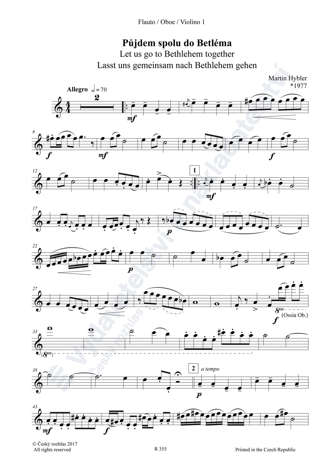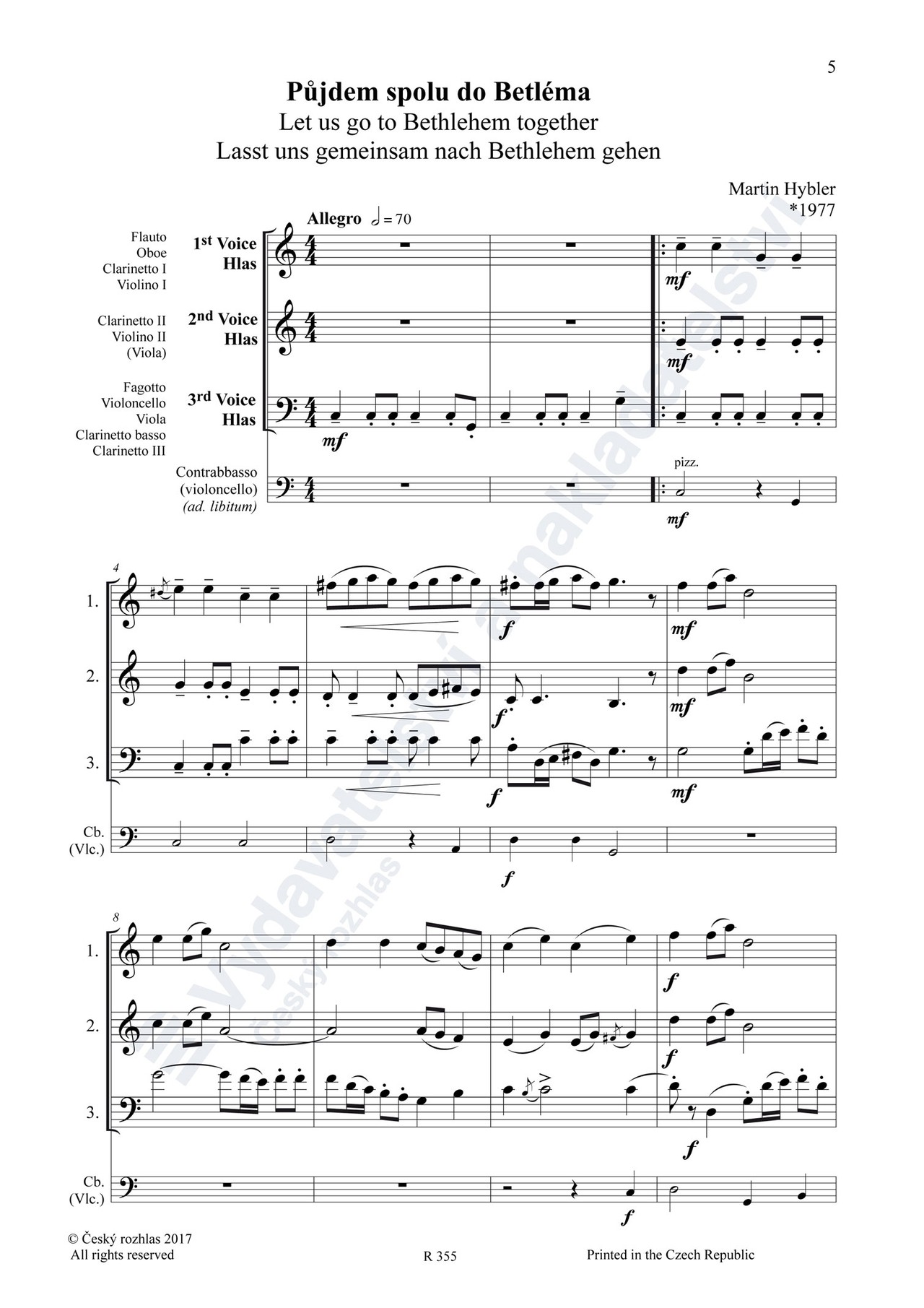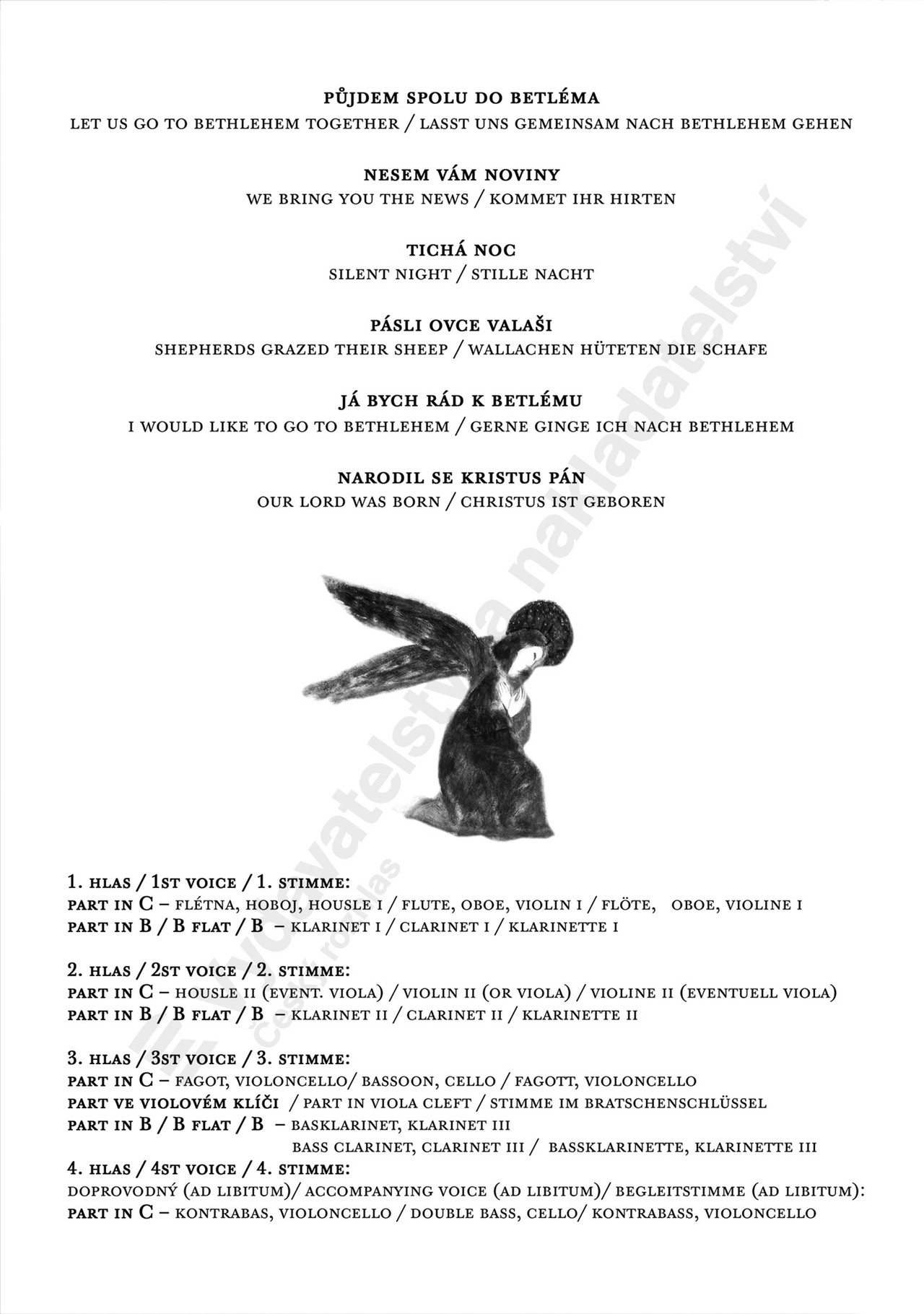 obsazení: 1. hlas in C: fl, ob, vno I / 1. hlas in Bb: cl; 2. hlas: vno II (vla) / 2. hlas in Bb: cl II; 3. hlas in C: fg, vcl / 3. hlas in Bb: cl III, bcl; 4. hlas in C ad libitum: vcl, cb