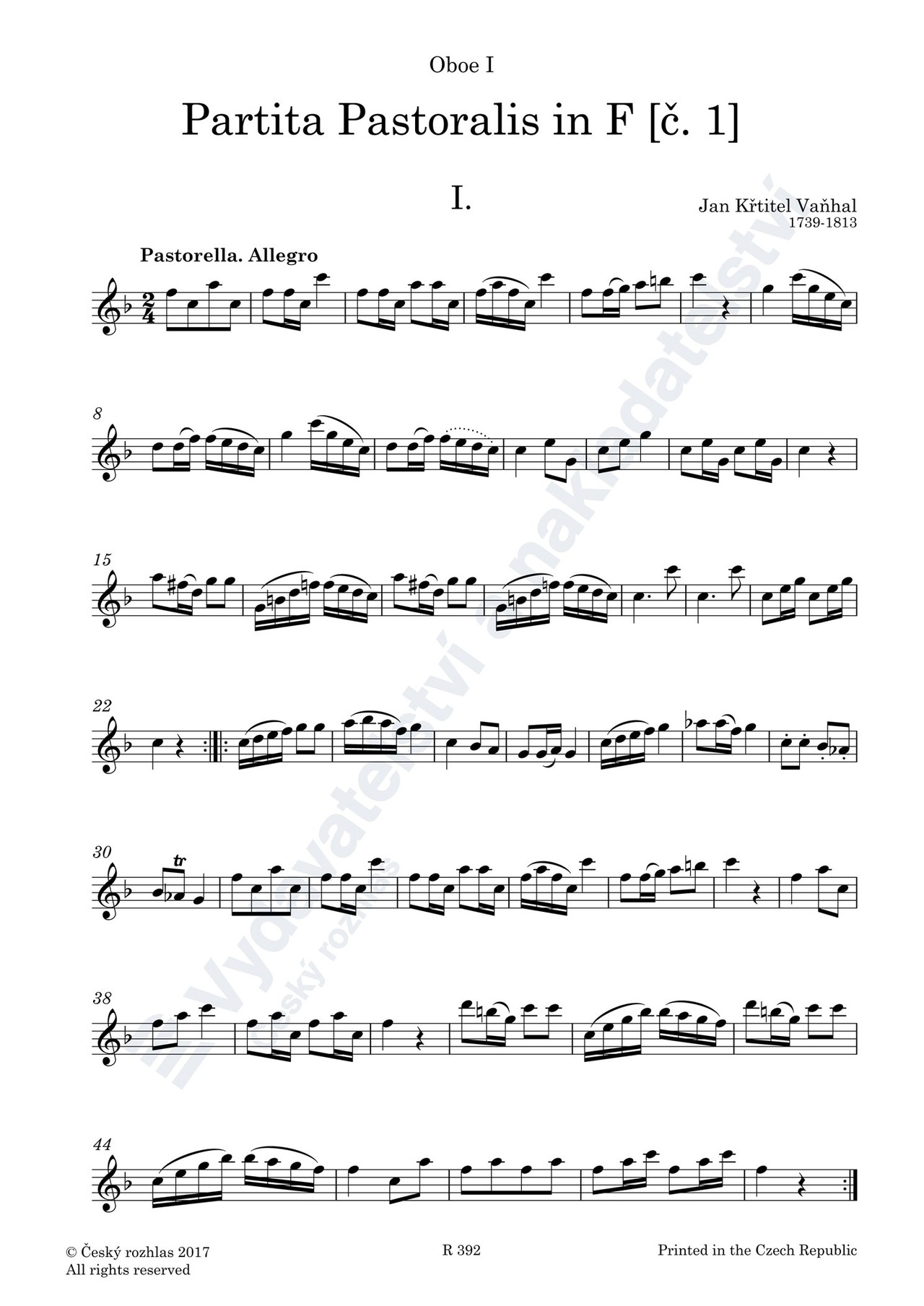 Anonymní Parthia Pastoralis (tak zní přípis na partech prvé věty) je uložena ve sbírkách Českého muzea hudby pod signaturou XLII C 219. Jedná se o rukopisný konvolut 5 hlasů na podélných nečíslovaných stranách – hlasy jsou označeny Oboa 1 (2 strany), Oboa 2da (2 strany), Cornu 1 ex G (2 strany), Cornu 2do ex G (2 strany), Fagotto (2 strany).
