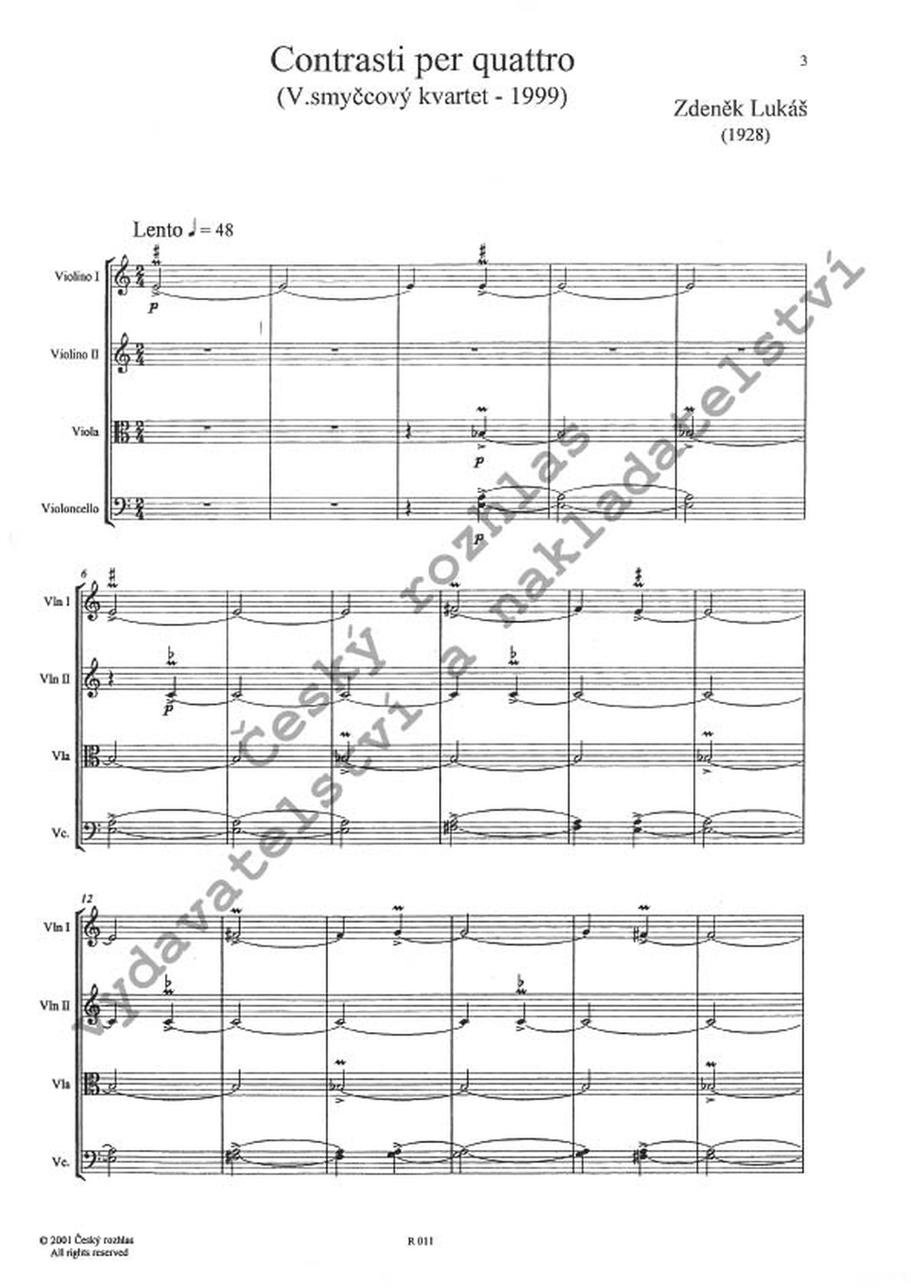 Posluchač i interpret se dočká všech šťastných momentů, které je možno slyšet ve všech skladbách Zdeňka Lukáše (*1929): průzračná ostinata, která umožní zářit novému tématu s invencí šťavnatou a vřelou v harmonickém zpracování logickém a přesto neotřelém. Autor trpělivě uvádí posluchače do nálady matnými harmoniemi v úvodu, jakoby pomalu nasvěcoval pódium pro budoucí kreace tanečníků - hlasů kvarteta. V závěru naopak nezapomíná ani na oponu, ani na jásavou poklonu všech zúčastněných. Je to hudba plná radosti ze života, energie a zvukové krásy.
