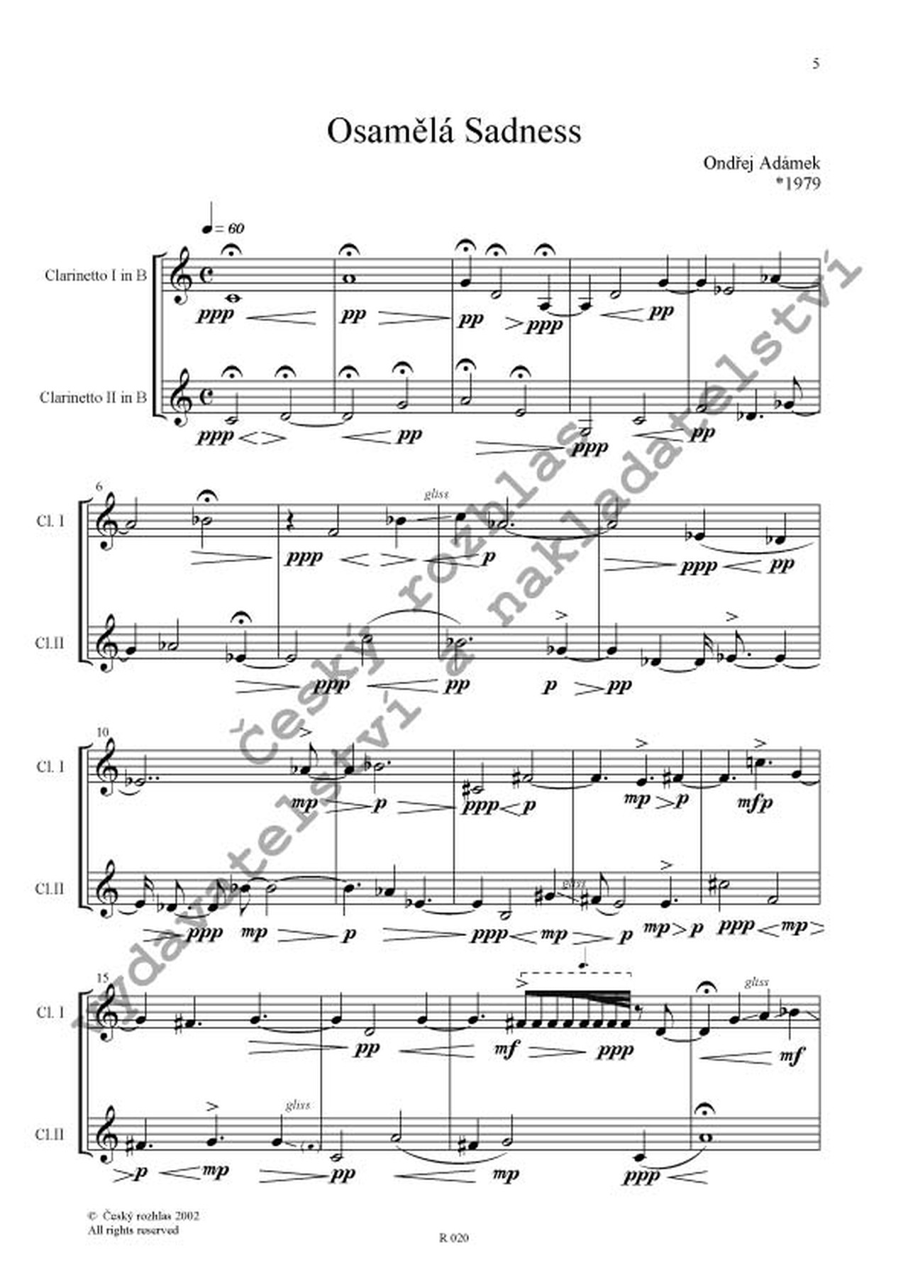 To je podnětem také k intervalovému výběru. Z harmonických souzvuků se postupným procesem dostáváme do napjatých dizonantních souzvuků a ploch. V dalších částech skladby autor pracuje s dozvukem a s napětím mezi čtvrttóny a mezi drobnými rytmickými odchylkami, využívá extrémní polohy klarinetu a k docíleni tónů hlubších než je rozsah nástroje předepisuje speciální techniky.Skladba byla na základě konkurzního poslechu a tajného hlasování vybrána k prezentaci na Mezinárodní tribuně skladatelů v Paříži (8. - 14. 6.2002).