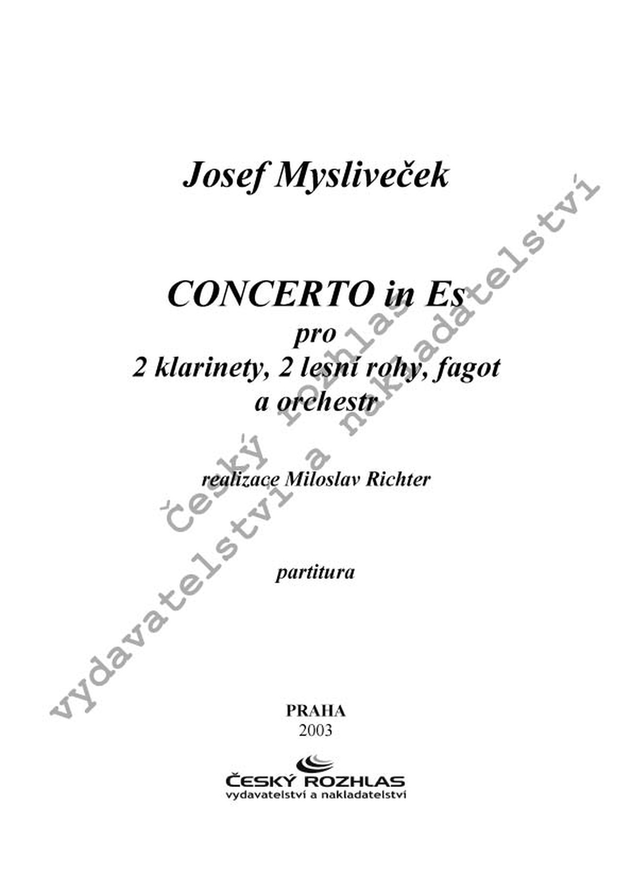 Předlohou k vypracování partitury Myslivečkova koncertu byly rukopisné hlasy uložené v archivu knížecího rodu Thurn-Taxisů v Řezně. Původní nadpis rukopisu zní: Concerto in Es a 2 Clarinetti in B, 2 Corni, 1 Fagotto, 2 Violini, Viola e Basso. Podnětem k vydání tohoto díla byla objednávka z regionálního studia Českého rozhlasu - Plzeň. Realizace úpravy koncertu se ujal člen Symfonického orchestru Českého rozhlasu, klarinetista Miloslav Richter.