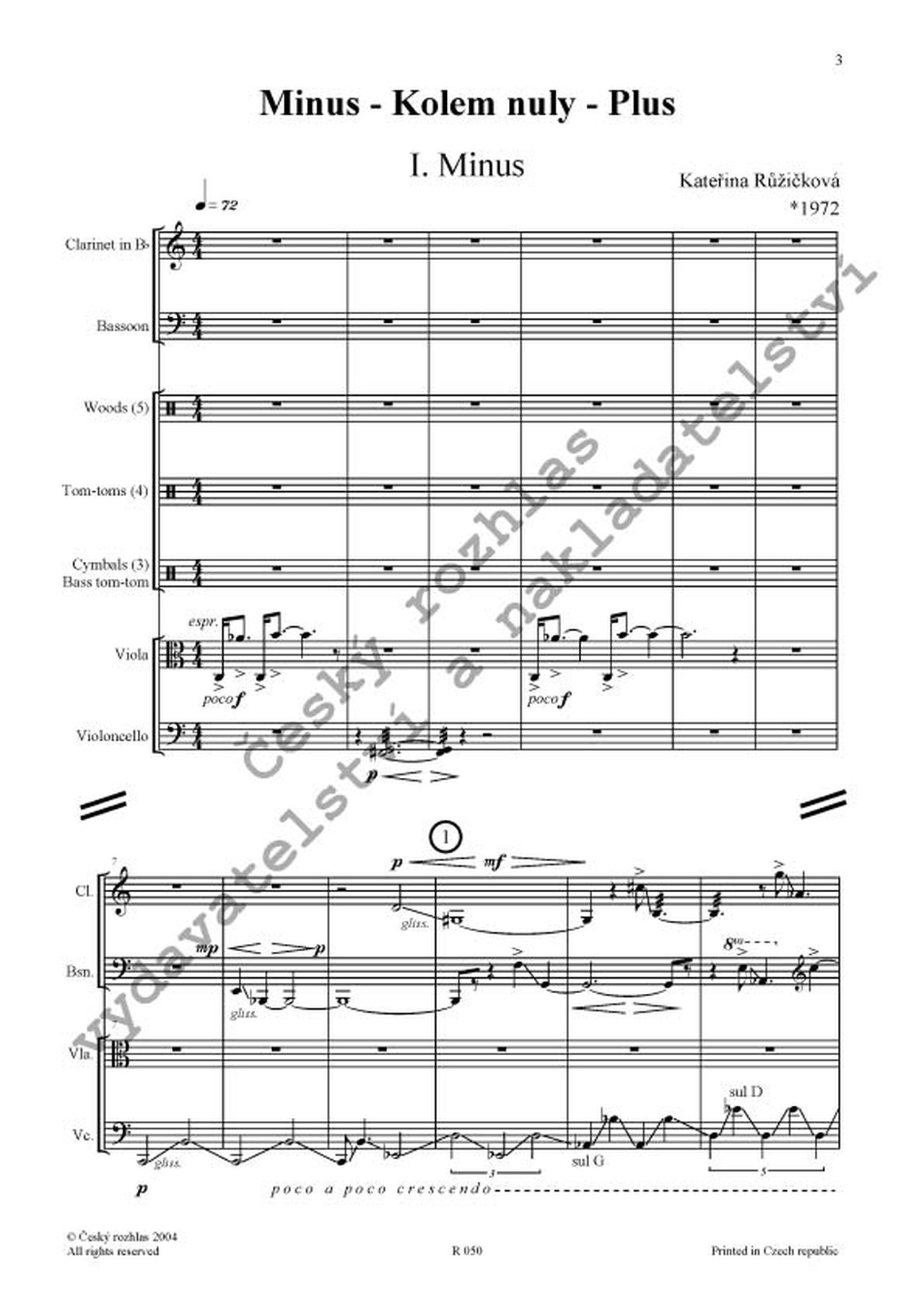 Septet pro klarinet, fagot, violu, violoncello a 3 hráče na bicí Minus - Kolem nuly - Plus napsala Kateřina Růžičková v roce 1997. Dílo je optimistickou verzí třídílné skladby, která se rozhodla vypovídat o třech elementárních stavech libovolného jsoucna: negativním, neutrálním a pozitivním.
