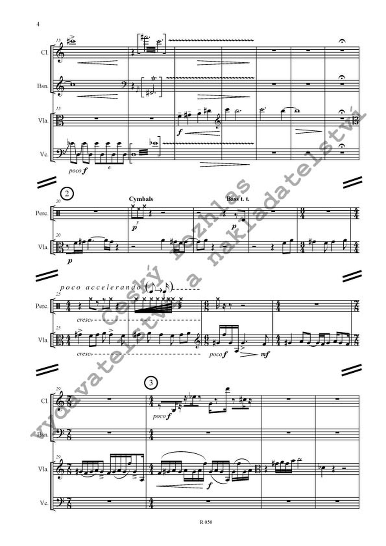 obsazení: cl, fg, vla, vlc, marimba, Wood blocks, tom-toms, bass tom-tom, cymbals, gongs, timpani