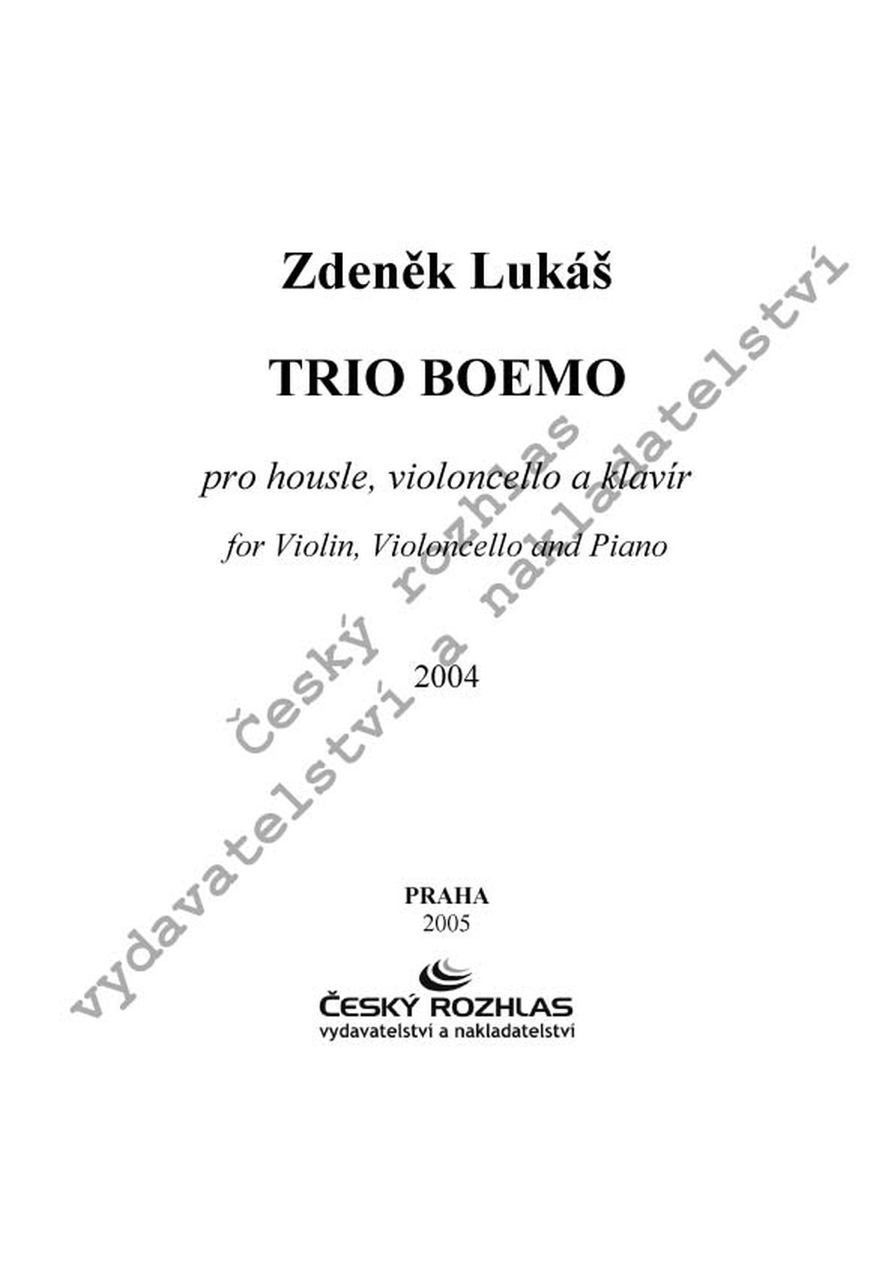 Druhá skladba pro klavírní trio komponovaná Zdeňkem Lukášem má název Trio Boemo. V porovnání s první skladbou z roku 1968, která je zatěžkána smutkem a dramatičností, je tato nadlehčená bezprostředností člověka vyzrálého k životnímu optimismu, jehož invence je s přibývajícím věkem stále radostnější a úsměvnější. V její zdánlivě neobvyklé dvoudílné formě se v začátku druhé věty skrývá jiskřivý rychlý střední díl. Průzračnou sazbu tohoto klavírního tria vytvořil Z. Lukáš na přání členů současného Českého tria, kterým také skladbu věnoval.