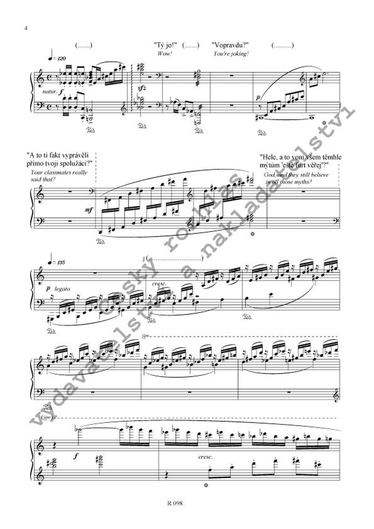 Příběh se odehrává na pozadí telefonického rozhovoru a líčí určité problémy komunikace dnešních mladých lidí. Hlavní reálná mužská postava (Martin) vede dialog s imaginární ženskou postavou (Katka). Pocit dialogu vzniká dedukcí slyšeného mužské textu, proto doporučuji dávat na formotvorné dlouhé pauzy v textu patřičný důraz. Klavír zde ve velké míře zastupuje onu imaginární ženskou postavu, jindy spíše jen zvukomalebně dokresluje absurdní scénu telefonního rozhovoru.
