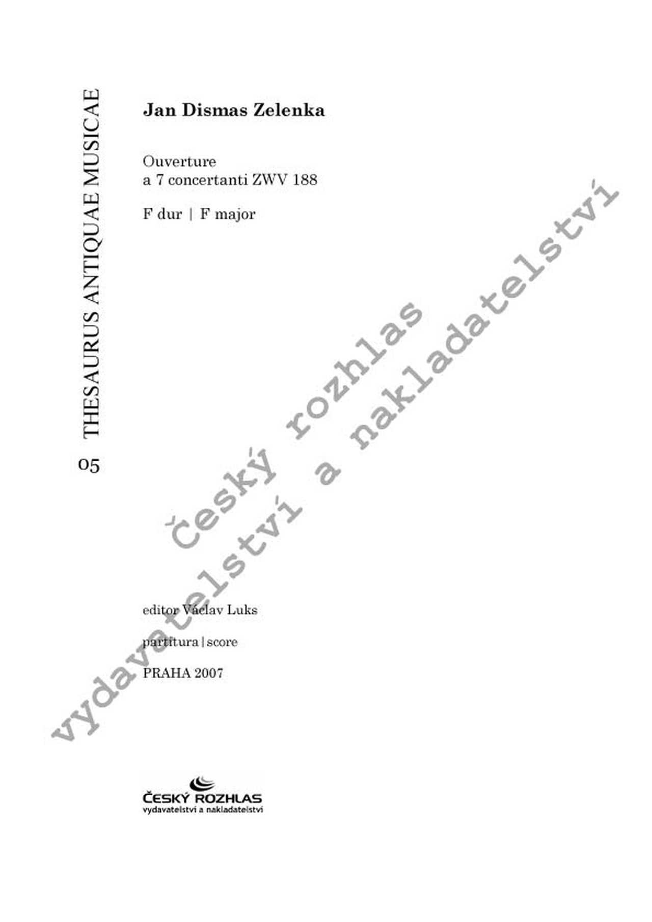 Dokladem je poznámka "a Praga 1723" na titulním listu autografní partitury (uložené v Saské knihovně v Drážďanech), která sloužila jako základní pramen tohoto kritického vydání. Přes špatnou čitelnost autografní partitury a její značné poškození bylo cílem dosáhnout autentického znění díla a zachování zvláštností Zelenkova hudebního jazyka. Ouverture a 7 concertanti F dur je v pořadí pátým titulem historické řady Thesaurus Antique Musicae.