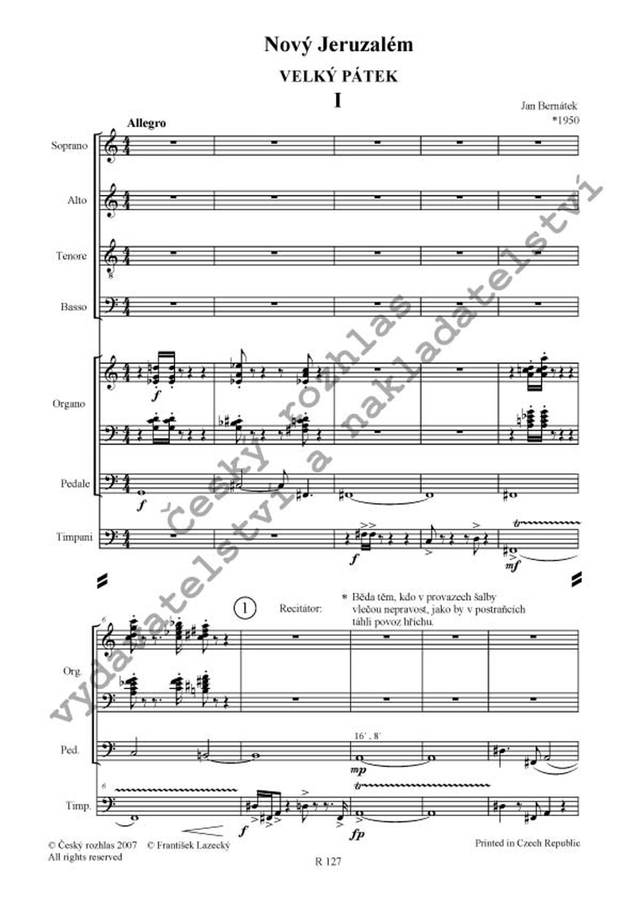 "Oratorium Nový Jeruzalém pro smíšený sbor, baryton a soprán sólo, varhany, bicí nástroje a recitátora patří k mým nejzávažnějším skladbám. První díl - Velký pátek - jsem nazval podle básně Františka Lazeckého, slezského básníka, žijícího v letech 1905 - 1984. V úvodu jsem použil text proroka Izajáše navozující dramatickou atmosféru prvního dílu, jehož závěr graduje textem: "Pak anděl úděsný na vaši hlavu nahrne běd, pod jehož dotekem srdce vám pukne žízní a žalem. Kdo potom utěší můj hříšný Jeruzalém."