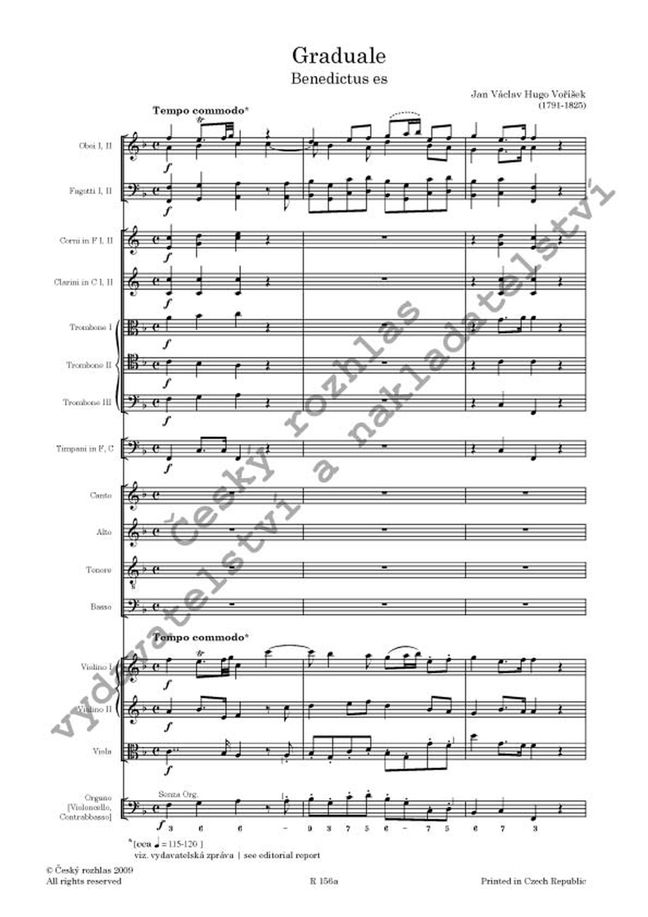 Jestliže je offertorium Quoniam iniquitatem cognosco reminiscencí na polyfonní chrámovou hudbu baroka, pak se zdá, že v graduale Benedictus es nacházíme ozvěny klasicistního pojetí tohoto žánru včetně slunné nálady svátečního dne, kterou právě hudba této éry dovedla často tak bezprostředně vylíčit. Obsazení je podobné jako u ostatních Voříškových duchovních skladeb – k hobojům, fagotům, trubkám, trombonům, tympánům, zpěvním hlasům, smyčcům a varhanám však zde jako v jediné ze čtyř přistupují lesní rohy, které posilují slavnostní zvuk orchestru. (Je to mj. i jeden z charakteristických instrumentů vánočních pastorel. Poznamenejme, že Voříšek svou mši končil ve vánočním období; je datována 6. 1. 1825). Uvážíme-li, že Voříšek komponoval offertorium Mentis oppressae i graduale Benedictus es přímo pro užití ve své Mši B dur, což dosvědčuje Aloys Fuchs, pak se nám toto graduale patrně bude jevit jako nejjasnější část a nepostradatelná barva jím promyšleně koncipovaného hudebního celku.
