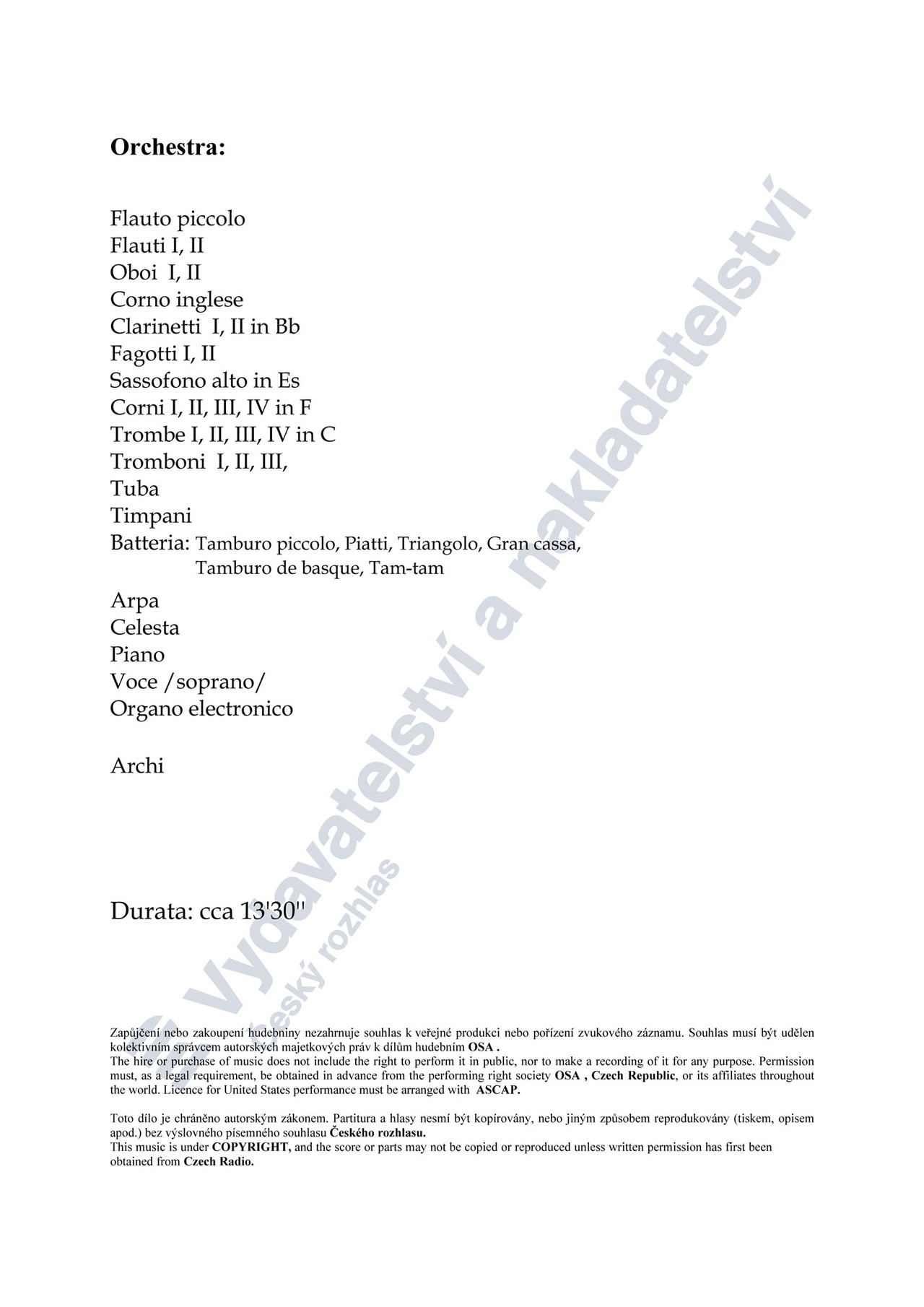 obsazení: voc (soprano) / el org ad lib., fl picc, 2fl, 2ob, cor ingl, 2cl in B, 2fg, Asax in Es, 4cor, 4trb in C, 3tbn, tb, timp, 5batt, arp, cel, pfte, archi