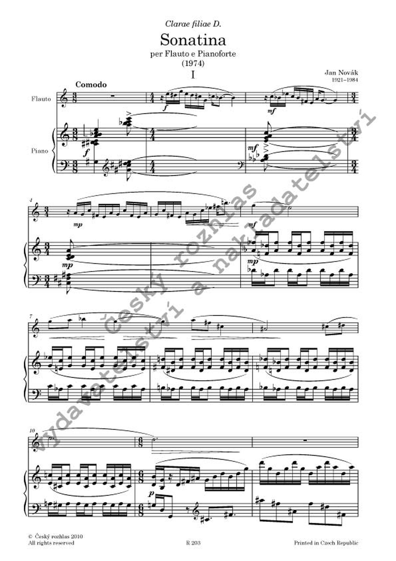 Když Jan Novák komponoval v roce 1976 v Riva del Garda v Itálii Sonatinu pro flétnu a klavír, myslel na mladé začínající flétnisty. I když je Sonatina velmi vhodná pro žáky a pokročilejší amatéry, má své místo také na koncertním programu.