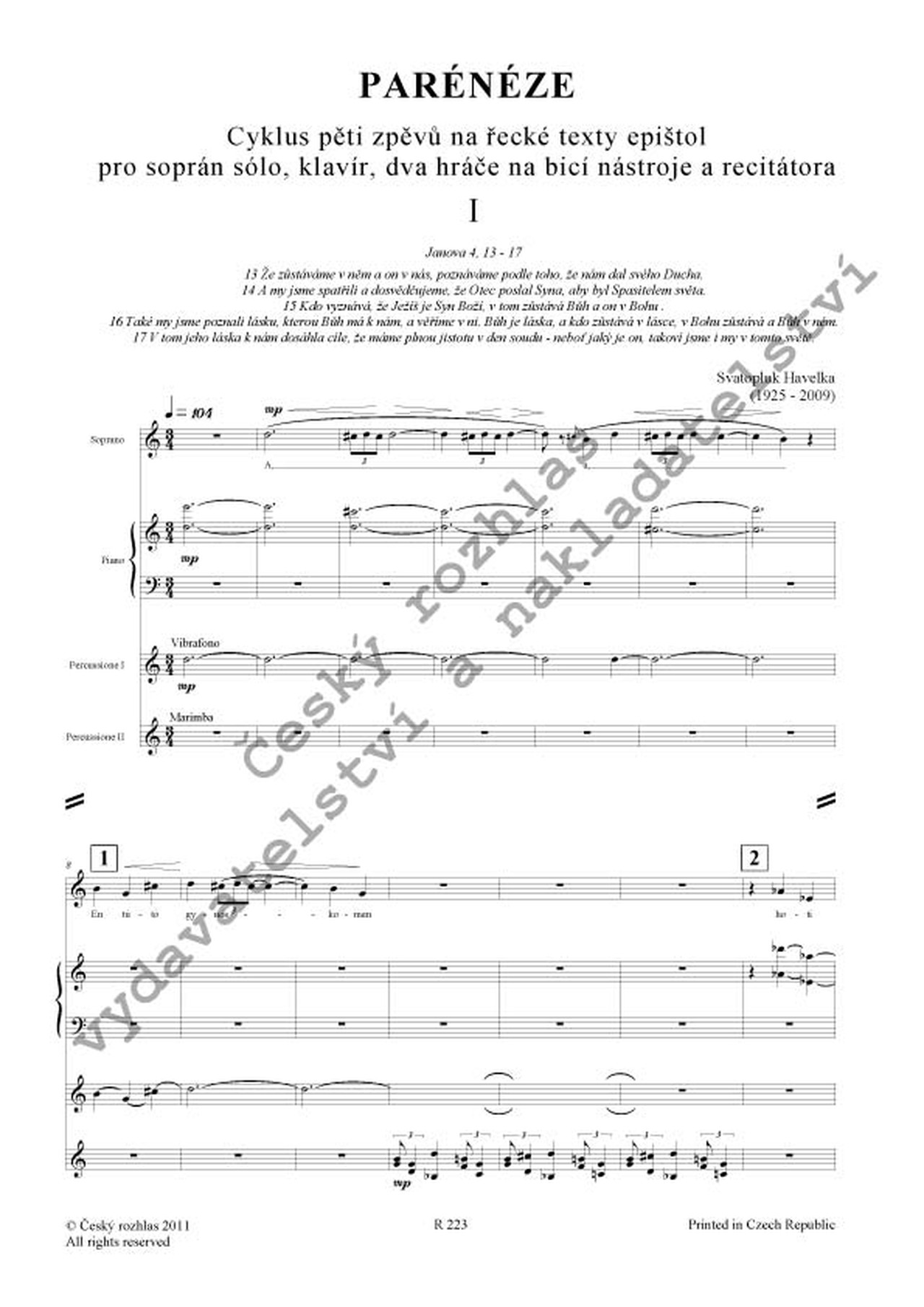 Pětidílné dílo Parénéze (v překladu doporučení, napomenutí či povzbuzení) pro soprán, bicí nástroje a klavír na řecké texty biblických epištol z roku 1993 je první skladbou, v níž se projevil Havelkův styl typický pro pozdní období jeho tvorby. Charakteristický je příklon k melodii jako určující složce kompozice. Havelka vytváří rozsáhlé různorodě členěné melodické fráze s typickými melismatickými postupy.