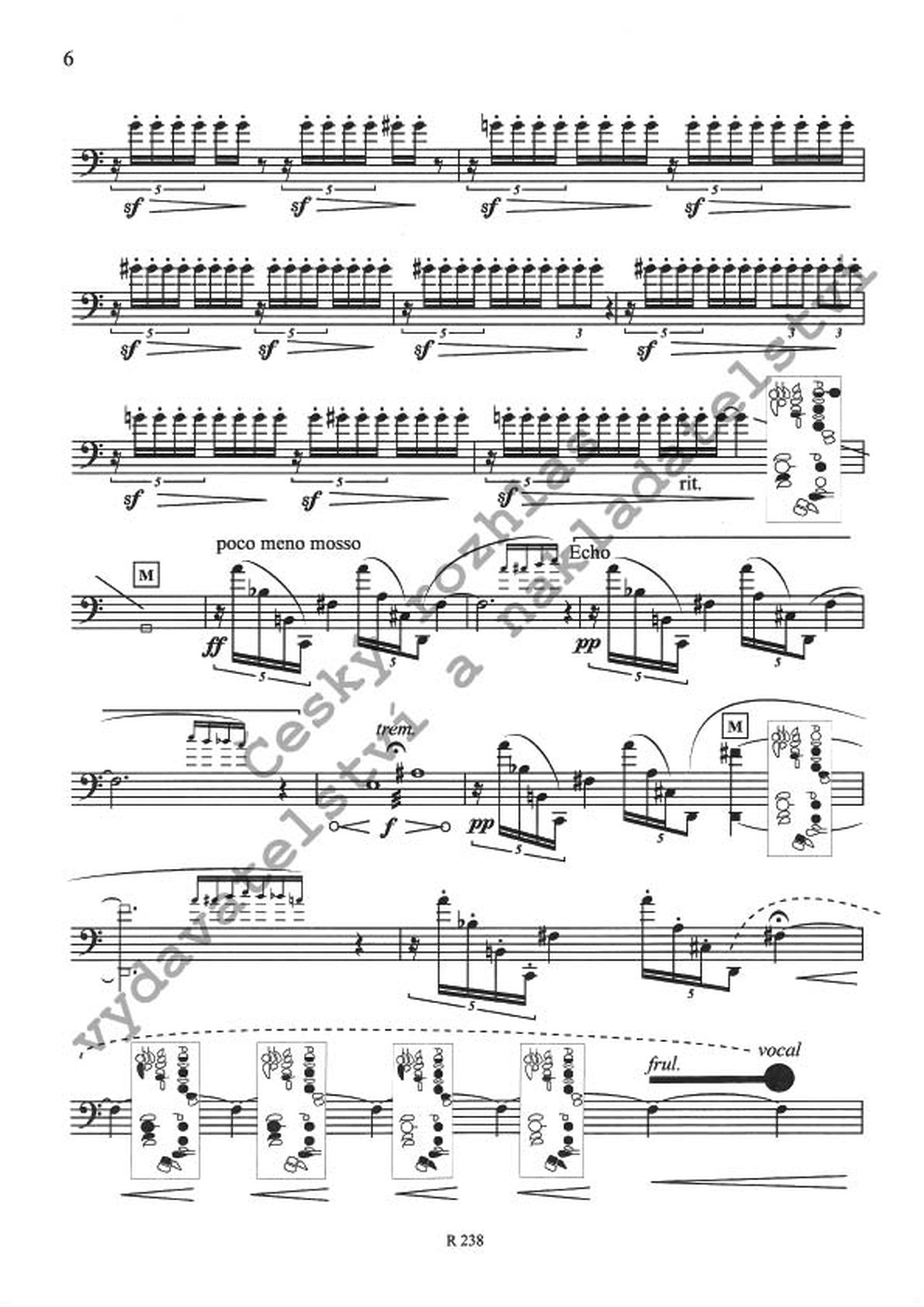 Ve skladbě se objevují bohatě artikulované tóny, multifoniky, bisbiglianda, glissanda a další techniky, které se v současných partiturách objevují čím dál častěji.