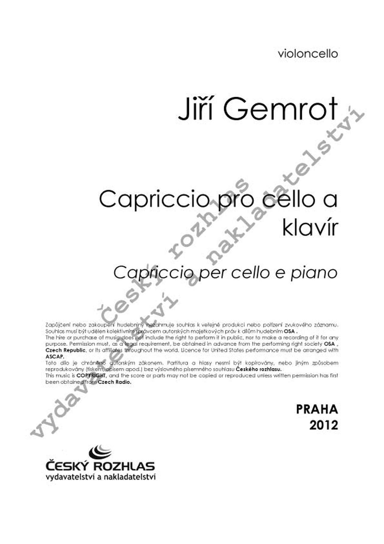 "Capriccio pro cello a klavír jsem napsal na přelomu roku 2011-12. Formálně je volněji pojatým rondem a ačkoliv na ploše šesti minut dává interpretům možnost předvést kantilénu, akordickou hru, pizzicata, umělé flažolety, glissanda, cit pro agogiku v kadenčně rozvolněných místech nebo rytmicky pregnantní techniku, usiloval jsem o jeho přirozeně ucelené vyznění. Prostředky pro efektní účin Capriccia jsem ale ve srovnání s mými jinými cellovými skladbami (Sonátou nebo oběma koncerty) volil s přihlédnutím k věku soutěžících." Jiří Gemrot
