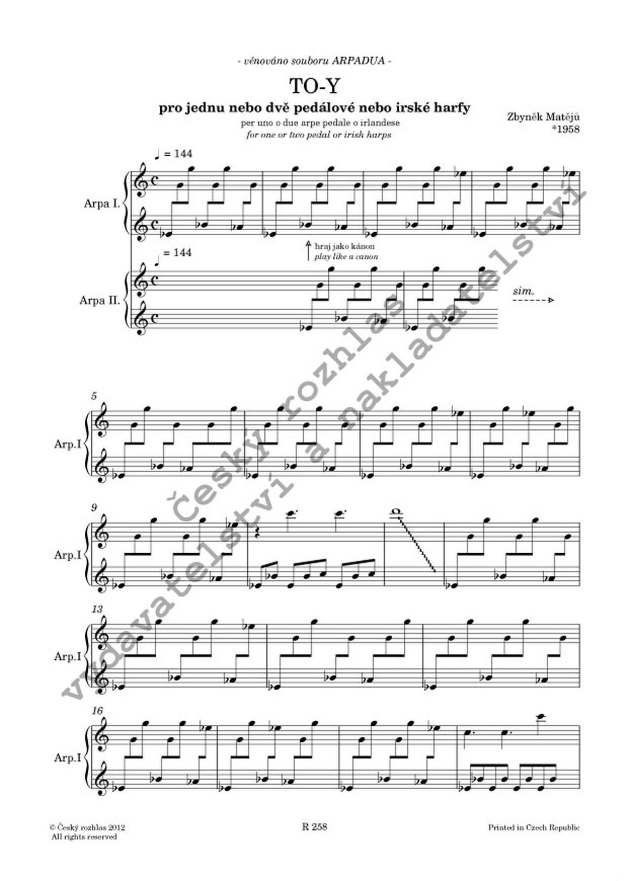 „Skladba TO-Y vznikla na objednávku souboru ARPADUA, který na svých koncertech využívá kombinace různých druhů harf, způsobů hry a jejich repertoár je neuvěřitelně široký - od klasické evropské hudby až po soudobé jihoamerické skladatele. Jejich koncerty srší energií, nebojí se experimentovat. Skladba „To-y“ je myšlena jako jakási „hračka“ pro interprety. Mohou rozhodnout, zda ji budou hrát ve verzi pro 2 koncertní harfy, dají přednost menším háčkovým nástrojům, či ji uvedou pouze jako sólo pro 1 nástroj. Důležité je dodržet souhru (stejné tempo) v obou nástrojích. Interpretům je také dána určitá volnost v dynamické stavbě.“ Z. Matějů
