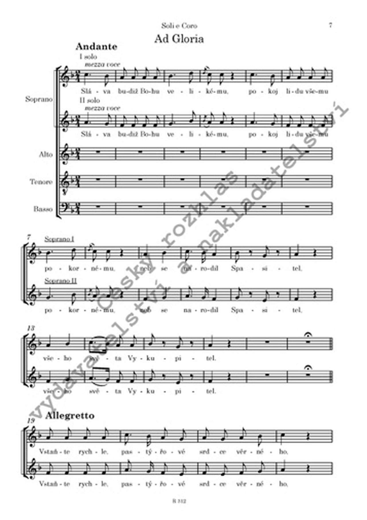 obsazení: fl, 2cl in Si bemolle ossia in Do, 2cor, trb in Si bemolle ossia clarino in Do/in Si bemolle, timp, org, archi, coro misto, SATB soli