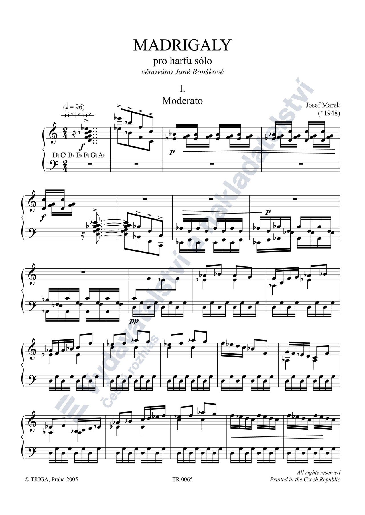 „Dost dlouho mě trvalo, než jsem se odhodlal k napsání skladby pro sólovou harfu. Nakonec za mě rozhodnutí učinila harfistka Jana Boušková, která mě o napsání Madrigalů pro sólovou harfu požádala a přislíbila revizi kompozice. Jsem jí za to opravdu moc vděčný.