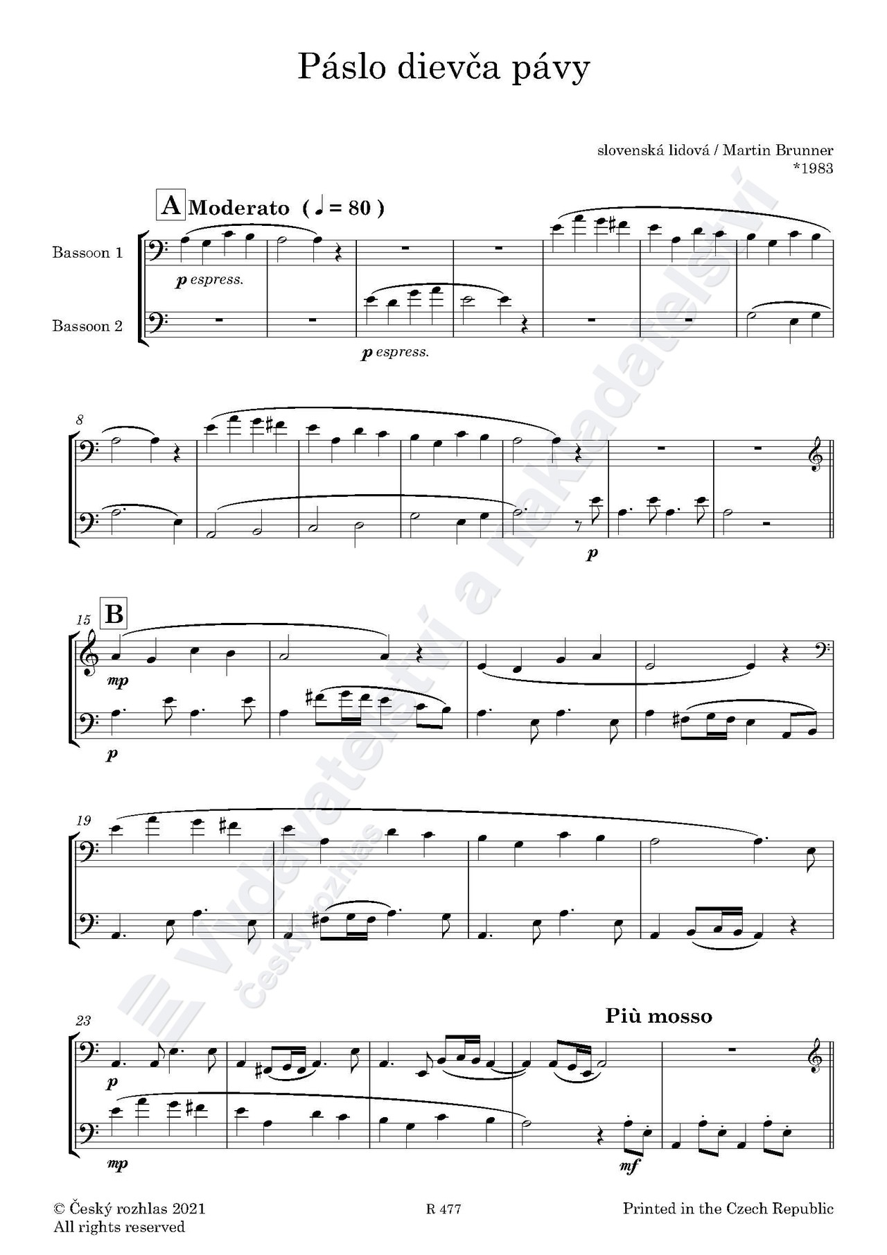 „Páslo dievča pávy a Ukolébavka jsou lidové písně, které si Denisa s Míšou z Dua Esperanza vybraly, abych je upravil pro dva fagoty a ony je tak mohly zařadit do reportoáru jako odlehčený prvek v programu. Přestože se jedná o jednoduché variace na melodie těchto písní, vyžadují pokročilou hráčskou zručnost.“