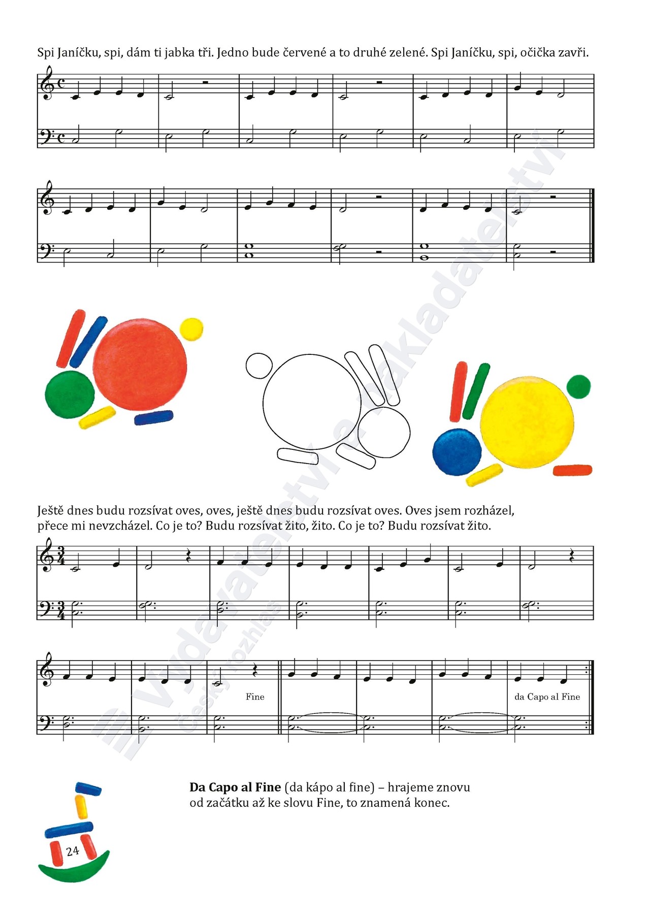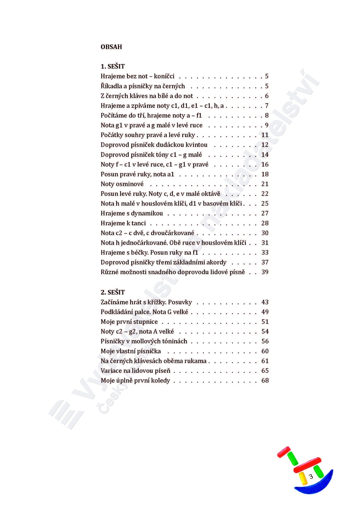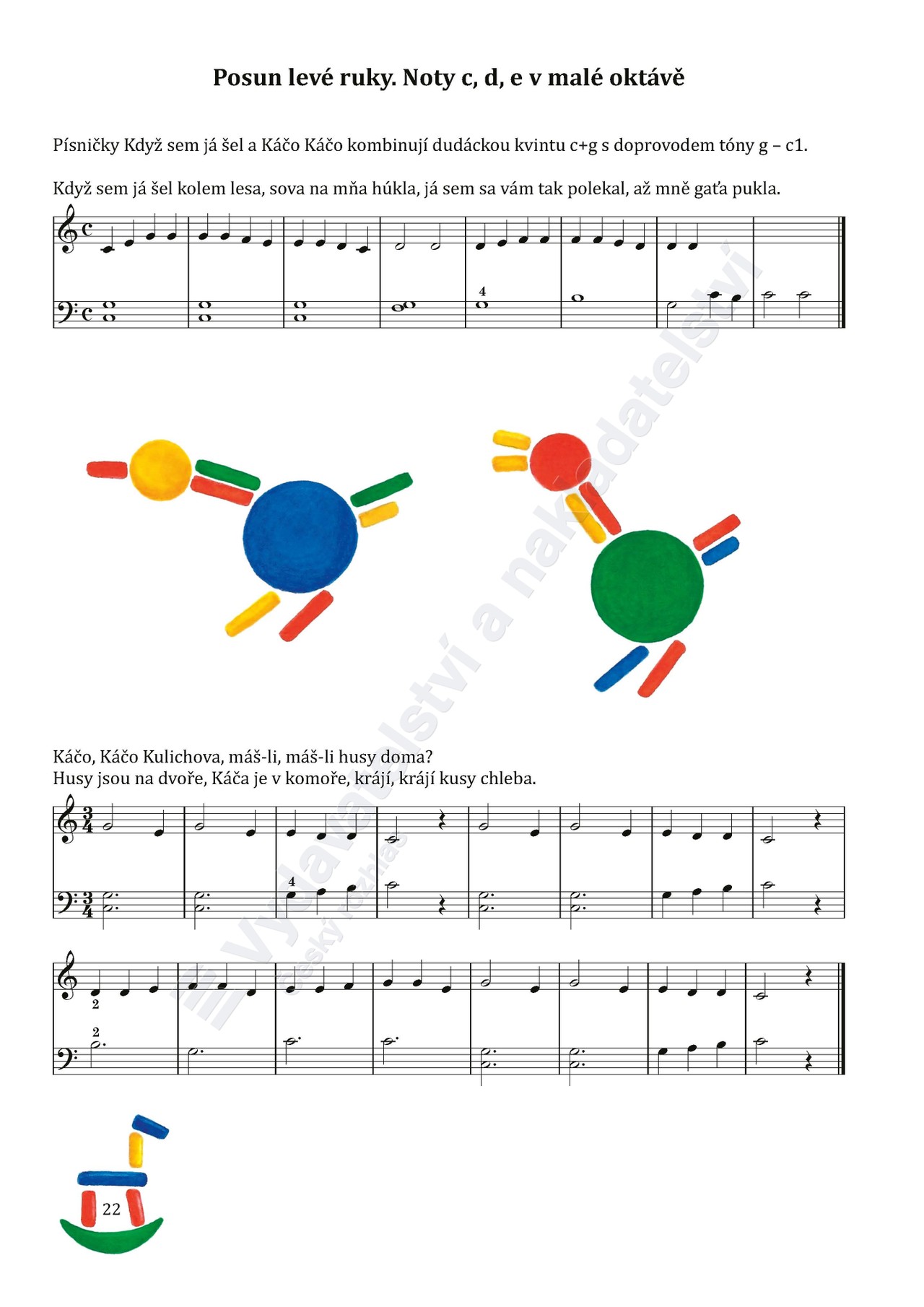 „Když přijdou malé natěšené děti na první hodinu, netouží ani tak umět za několik let hrát na klavír, jako teď hned si zahrát něco, co je baví. Lidové písničky se malým dětem líbí, protože jim dávají možnost nahlédnout do minulých dob podobně jako klasické pohádky. V této škole jsou seřazeny postupně od prvních úhozů na klaviatuře až po snadný kontrapunkt, každá je vždy jedním malým krůčkem kupředu. Děti se tak poznenáhlu naučí nebát se not, hry na černých klávesách, transpozice. Škola je kompatibilní s Novou klavírní školou a Evropskou školou, pro méně ambiciózní klavíristy může klavírní školu úplně nahradit. Je rozdělena do dvou sešitů, aby se dobře otevírala a nepadala vám s pultíku do kláves.“