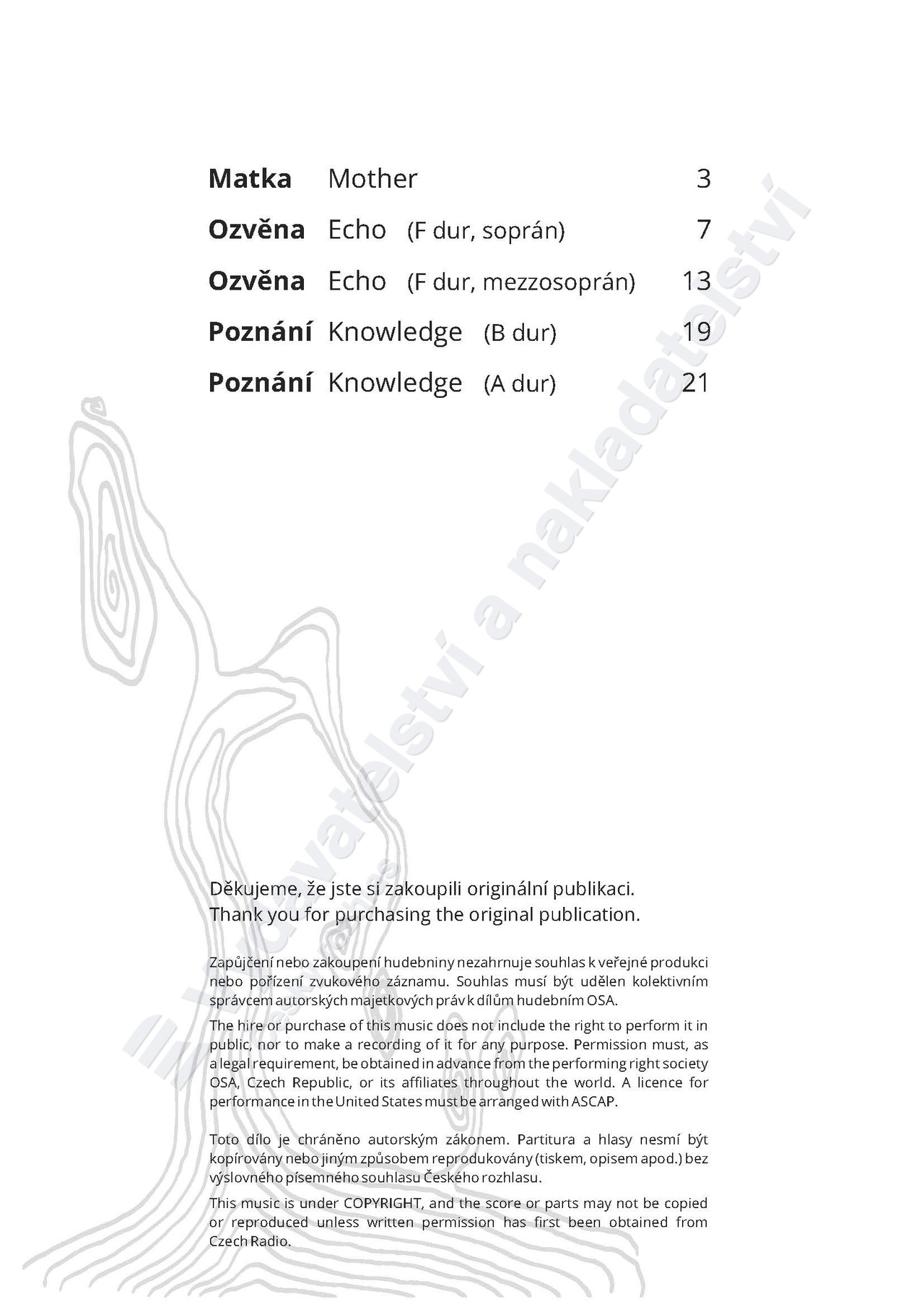Matka je žánrově i emočně blízká šansonům Jacquese Brela a má vyvolat pocit lidské odpovědnosti a vřelosti. Ozvěna je vedena v duchu lidové balady s nostalgií autorské vzpomínky na melodiku moravské hudby. Poznání je v duchu písní a romancí romantického stylu a uzavírá cyklus svým hudebním i slovesným obsahem. Specifikace tónin je realizována na základě stanoveného hlasového rozsahu i představy a přání konkrétních interpretek.